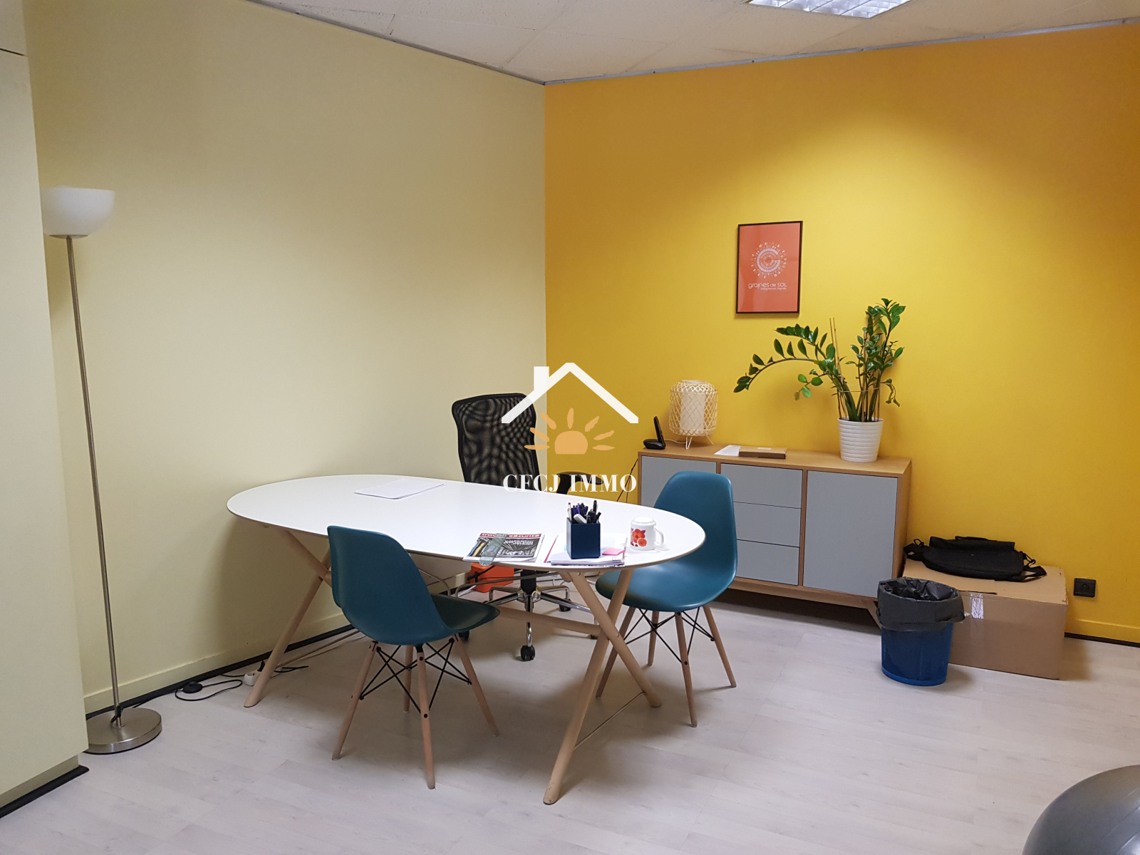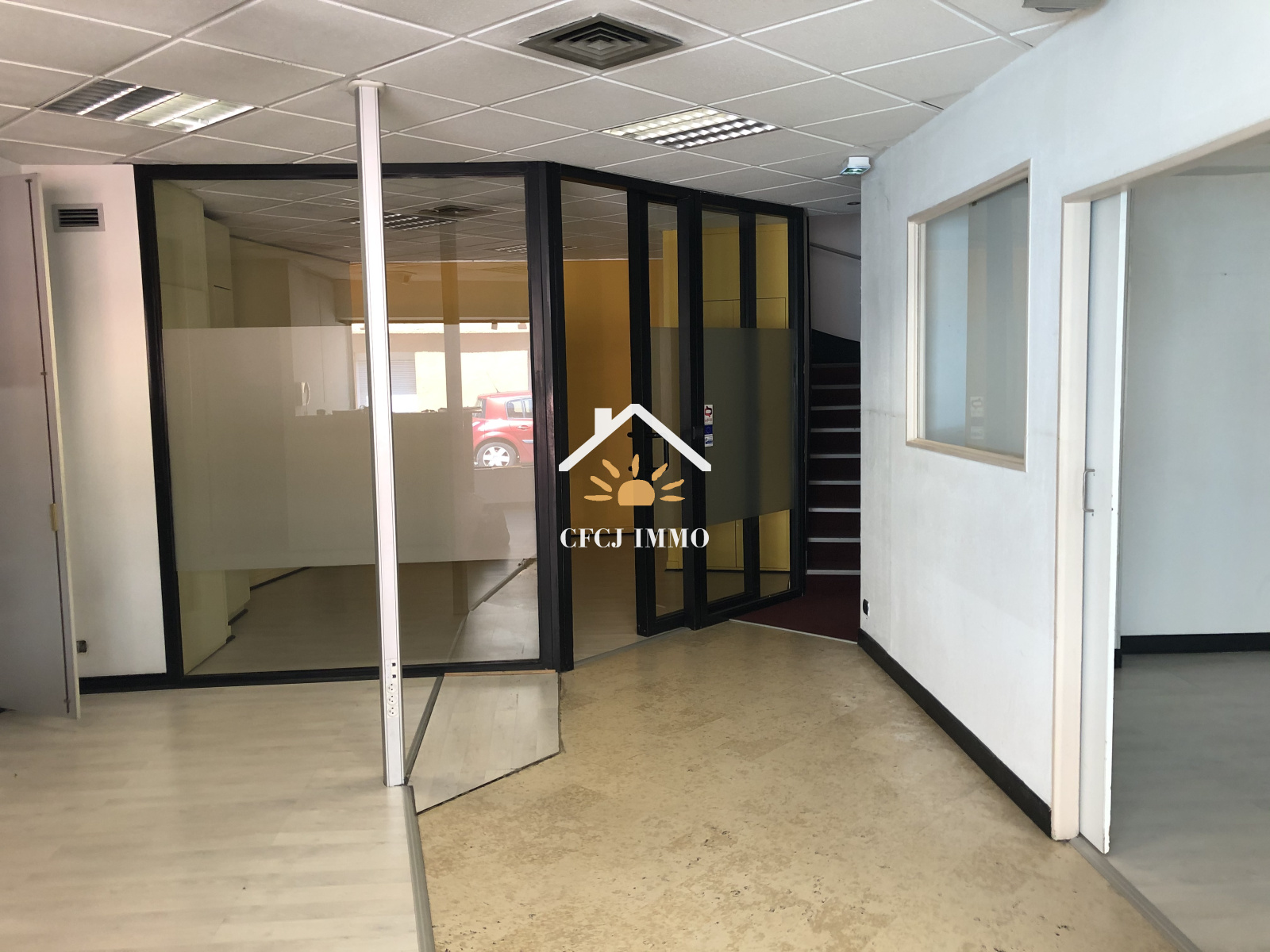 En réez de chaussée, un sas d'entrée, pièce d'accueil, 2 bureaux dont 1 très grand avec de nombreux rangements ainsi qu'un local de stockage. A l'étage, 5 bureaux vitrés avec stores comprenant tous des placards, des sanitaires, placard et un accès au grenier.